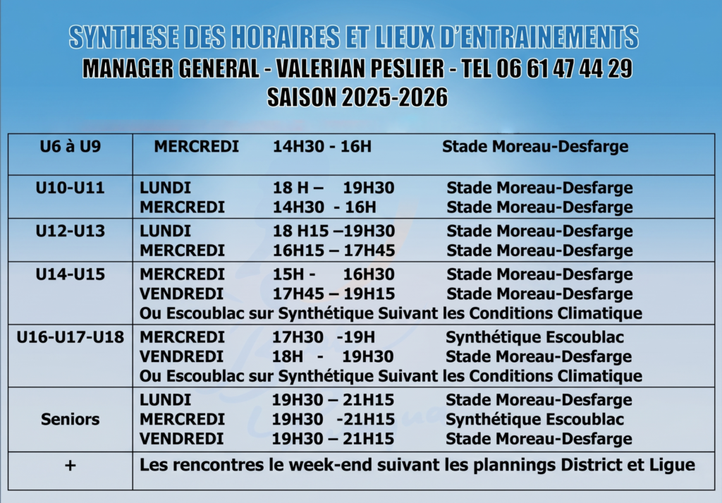 HORAIRE ENTRAINEMENT